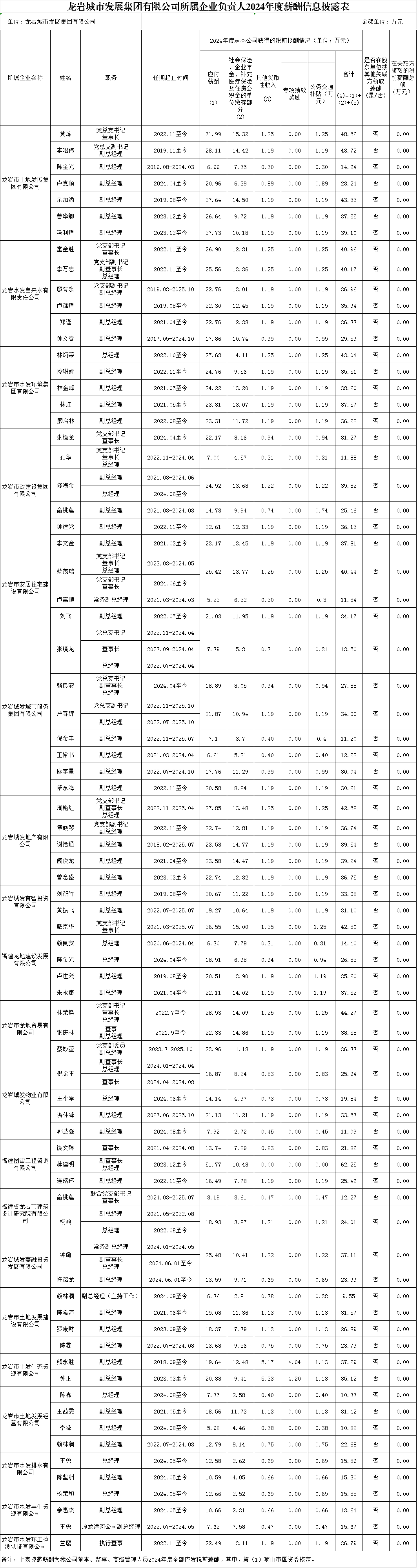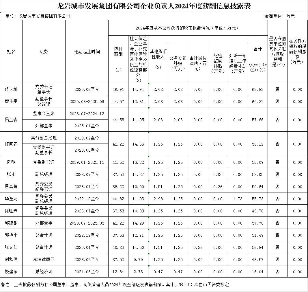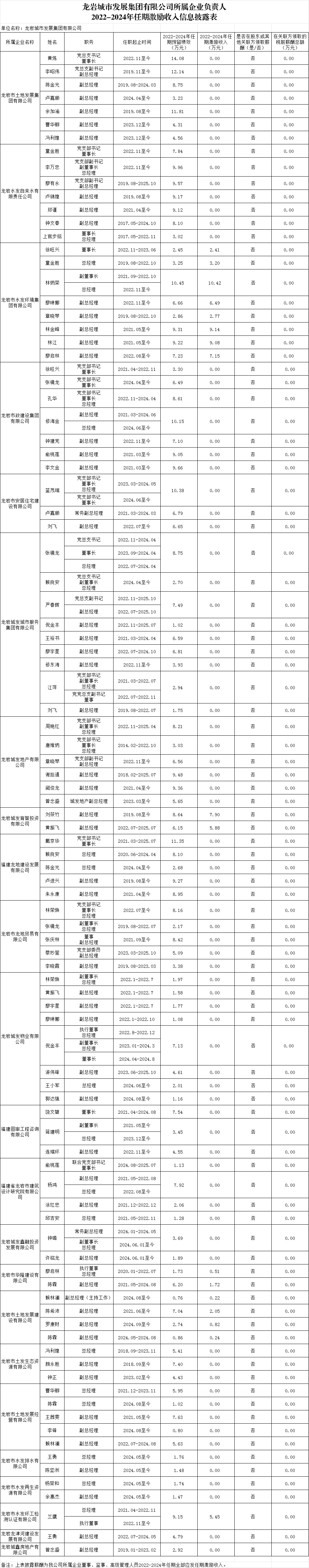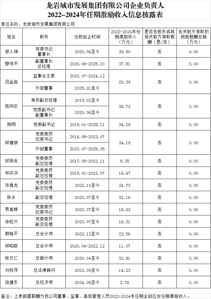 龍巖城市發展集團有限公司及所屬企業負責人2024年度薪酬、2022-2024年任期激勵收入信息披露表